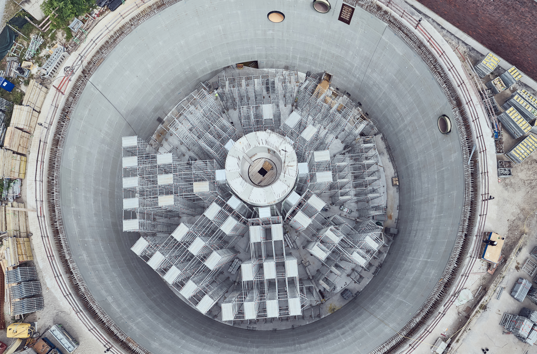 Die Montage eines Traggerüsts für das Betonieren der meterhohen Decke von „Berlins größter Regentonne“ stellte die Karl Köhler Bauunternehmung vor einige Herausforderungen: die runde Form mit einem Durchmesser von rund 40 m. Das sichere Ableiten der hohen Vertikallasten über eine Stützhöhe von 18 m. Und das Umsetzen von Baustellenanforderungen wie die Integration eines Treppenturms für den Baustellenzugang sowie einer sicheren Arbeitsebene unterhalb der Schalung. Die Kombination aus Digitalisierung auf Grundlage des Prozesses Layher SIM sowie Einsatz des Allround Traggerüsts TG 60 in Verbindung mit dem hochtragfähigen Aluminium-Träger TwixBeam als Jochträger ermöglichte eine optimal an die Gegebenheiten angepasste und trotzdem materialsparende Traggerüstkonstruktion. Dies sorgte für eine hohe Baustelleneffizienz.