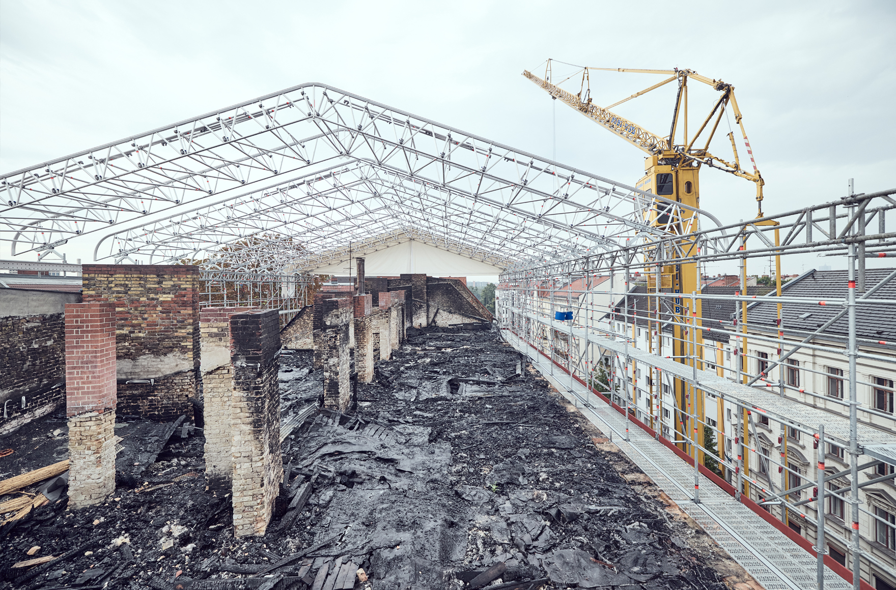 In Berlin stand ein Wohnhaus in Flammen und muss nun saniert werden. Um den Dachstuhl während dieser Zeit vor Witterungseinflüssen zu schützen, montierten die Gerüstprofis von A. Walther Gerüstbau aus Teltow ein Kederdach XL mit rund 20 m Spannweite. Dieses lässt sich dank verschiedener Aussteifungsvarianten auch bei hohen Schneelasten einsetzen und ist wirtschaftlich in der Montage. Dafür sorgen die leichten Bauteile aus Aluminium, die integrierten Kederprofile und die Verbindungtechnik per Einrastklaue. Beim Arbeits- und Stützgerüst gewährleistete das AGS einen schnellen und zugleich sicheren Auf- und Abbau. Die Überbrückung eines angrenzenden Gebäudes war ebenfalls problemlos möglich: mit dem Aluminium-Träger TwixBeam. Eine Lösung mit System.