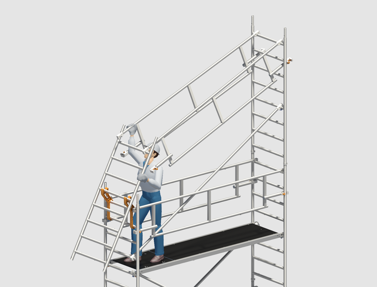 Safety structure P2 SAFETYPLUS with the new double guardrail implements a collective safety measure for rolling towers, in the form of system-integrated advancing side protection ensuring greater safety when moving up to the next level. Assembly and dismantling are only possible from the next level below that is already secured. That technically rules out any circumventing of the safety regulations, and full compliance with the current version of DIN EN 1004 and with the valid European health and safety legislation is assured. More safety for the user and hence for the client too.